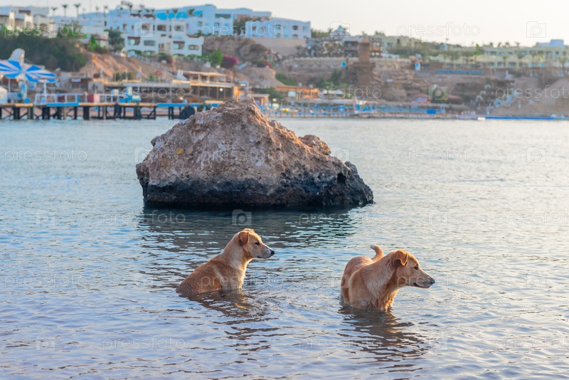 Две брошенные собаки восхищаются морским пейзажем, сидя в море у берега