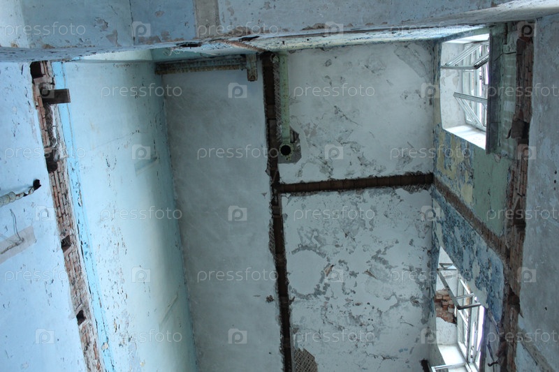 Старый разрушенный потолок в доме с разрушенными лестницами и плитами пола