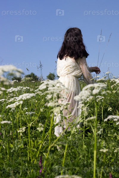 Молодая женщина с широко развернутыми объятиями наслаждается солнечным летним днём, вид из-за спины