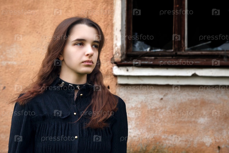 Молодая готическая девушка выходит из заброшенного дома в мрачный летний день