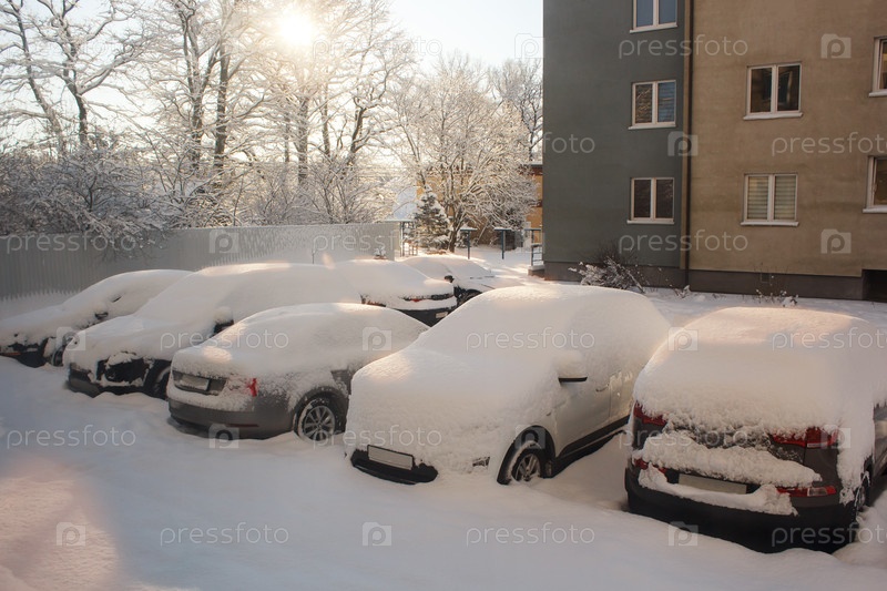 Автомобили, покрытые снегом зимой на открытом воздухе в солнечный день