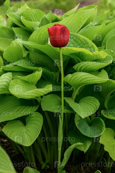 Красный тюльпан на фоне листьев