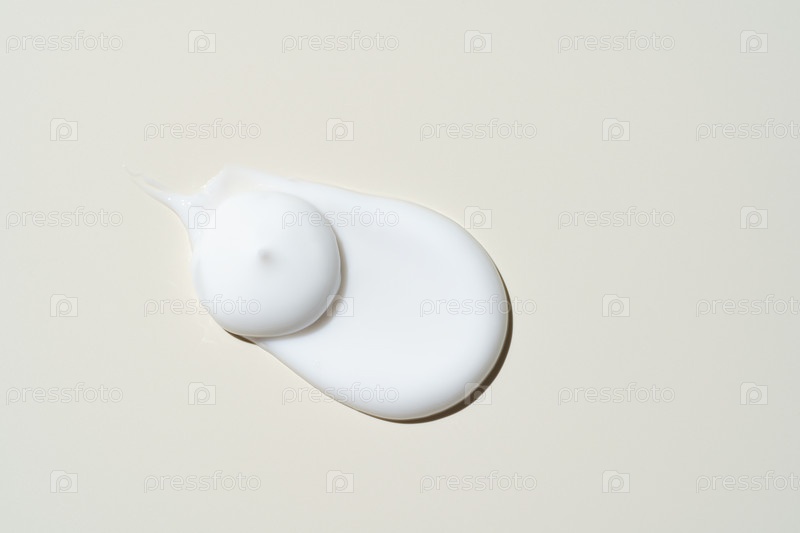 Белая текстура косметических кремов, лосьонов по уходу за кожей на светло-бежевом фоне. Крем для лица, увлажнитель тела, волосатый тампон. Кремовый косметический продукт Closeup