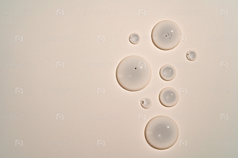 Чисто прозрачная косметическая сыворотка капли на бежевом фоне, текстура глицерина ухода за кожей