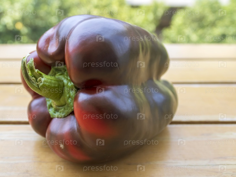 Большой красно-зеленый сладкий перец на садовом столе, ближайший снимок