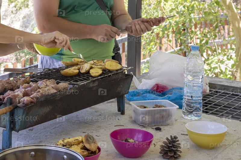 Приготовление кебабов и жареных картофелей на гриле во время пикника