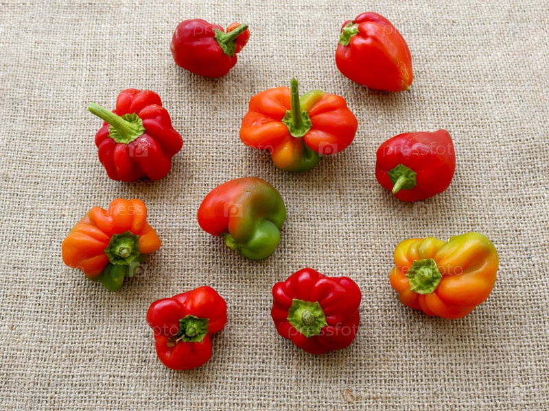 Несколько нестандартных красно-зелено-желтых сладких перцев на мешке