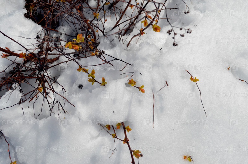 Снегопад в мае, кустарники с листьями под снегом