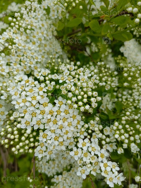 Близкий взгляд на белоцветные растения с небольшими скоплениями нежных белых цветов и зеленых листьев.Сцена захватывает красоту природы весной
