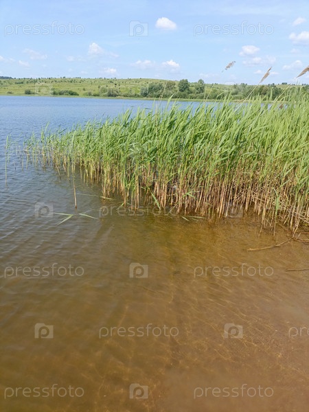 Спокойная сцена озера с высокими зелеными тростниками вдоль берега воды.Чистое голубое небо отражается на спокойной поверхности воды, создавая тихую атмосферу