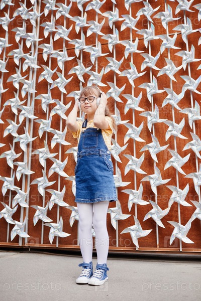 Девушка с синдромом Дауна слушает музыку на свежем воздухе