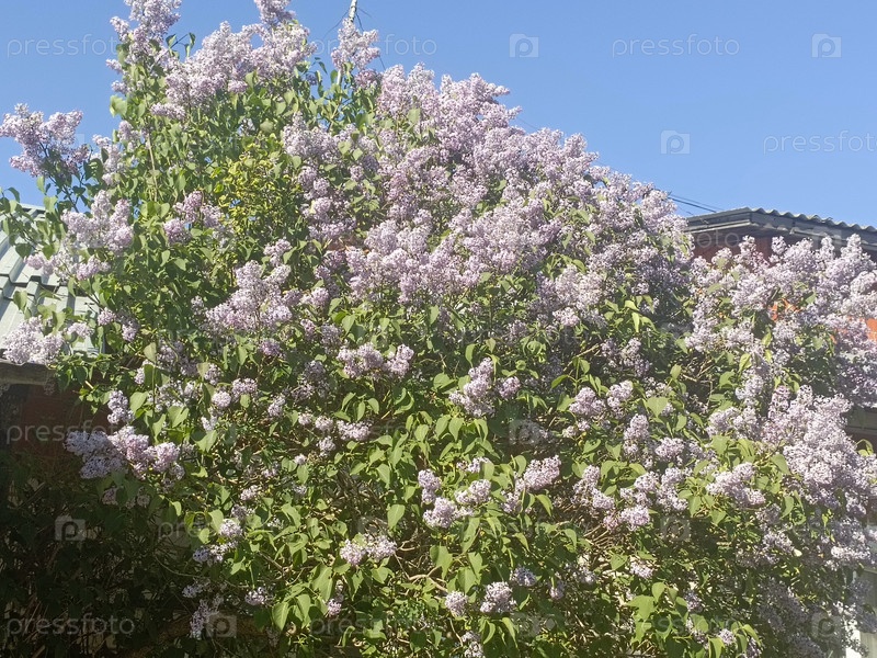 Яркий лиловый куст в полном цветении под чистым голубым небом.Цветы светло-фиолетовые с пышными зелеными листьями вокруг них