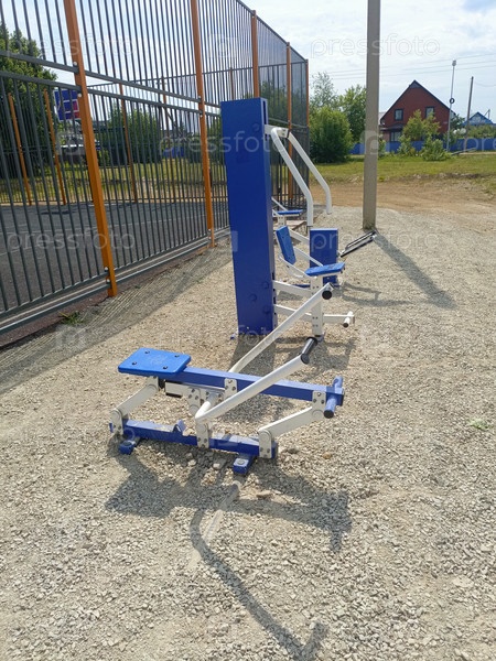 Внешнее фитнес-оборудование в парке. автомобиль имеет синий и серебряный дизайн, окружен гравием и забором. зеленые деревья и здание на заднем плане