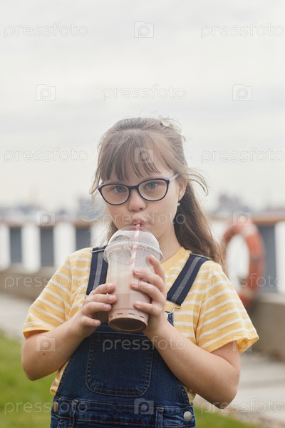 Милая девушка с синдромом Дауна пьет молочный коктейль летом