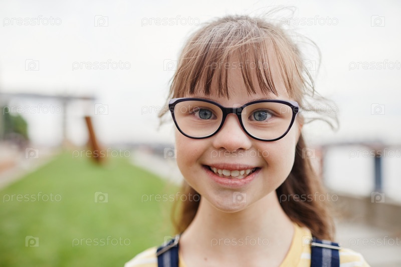 Улыбающаяся девушка с синдромом Дауна на открытом воздухе