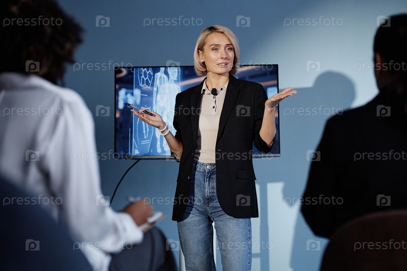 Женская спикер ведущая речь об использовании ИИ в бизнесе в аудитории