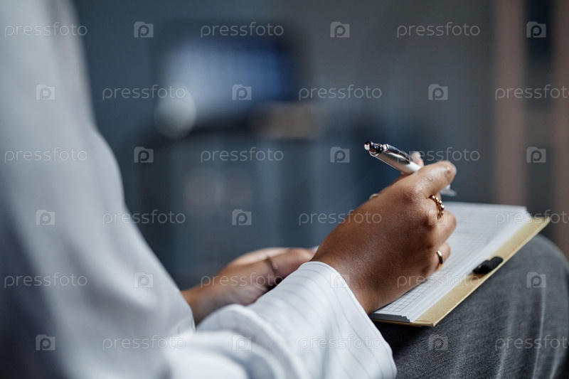 Руки чернокожей женщины, пишущей в блокноте на деловой конференции в помещении