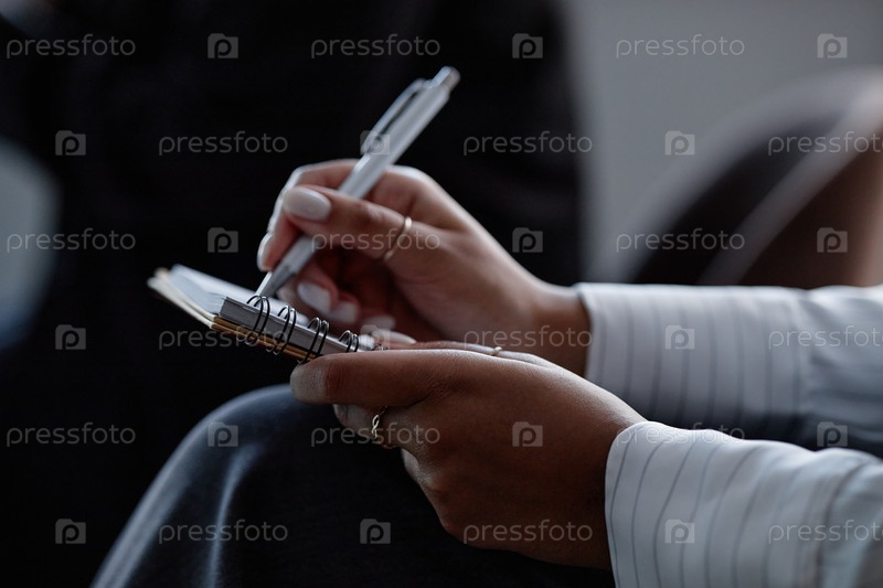 Руки чернокожей женщины, пишущей в блокноте на деловой встрече внутри дома