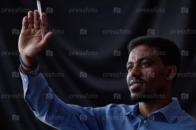 Улыбающийся чернокожий мужчина задает вопрос на бизнес-конференции