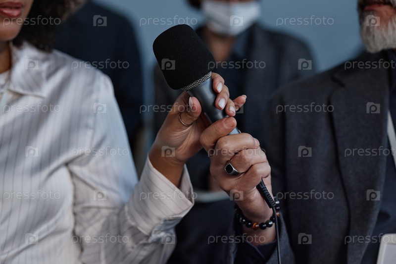 Рука мужчины, передающей микрофон черной коллеге на деловой встрече