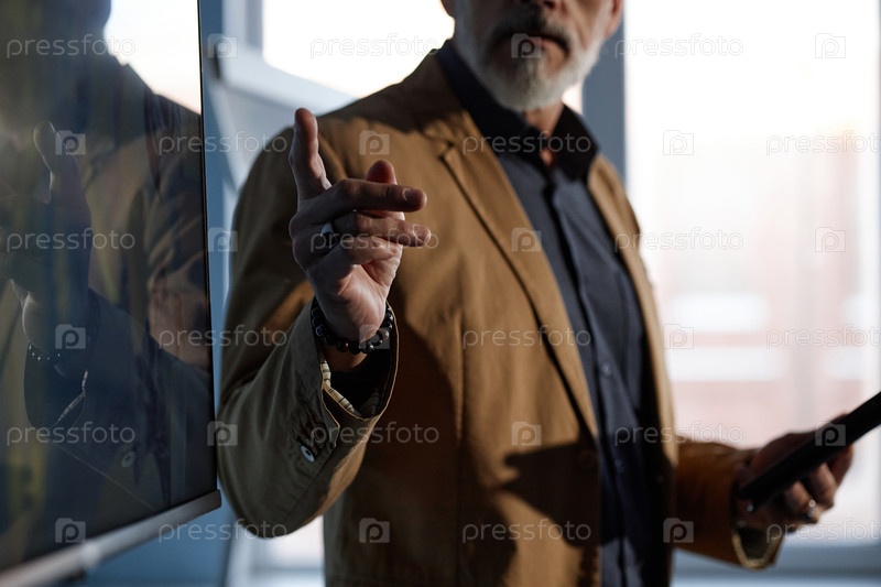 Старший оратор-мужчина указывает на экран с презентацией в аудитории