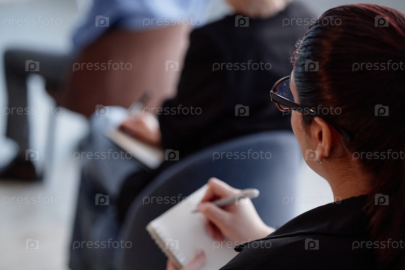 Деловая женщина пишет, посещая презентацию в конференц-зале