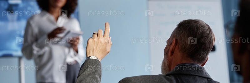 Header Image of Man Raising Hand to Ask Question at Business Conference Человек поднимает руку, чтобы задать вопрос на деловой конференции