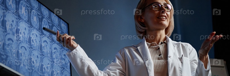 Заголовок изображения женщины-врача, указывающей на экран во время презентации в аудитории