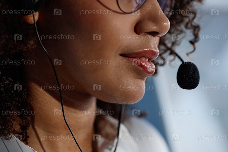 Женский спикер, носящий наушники микрофон дающий презентацию в помещении