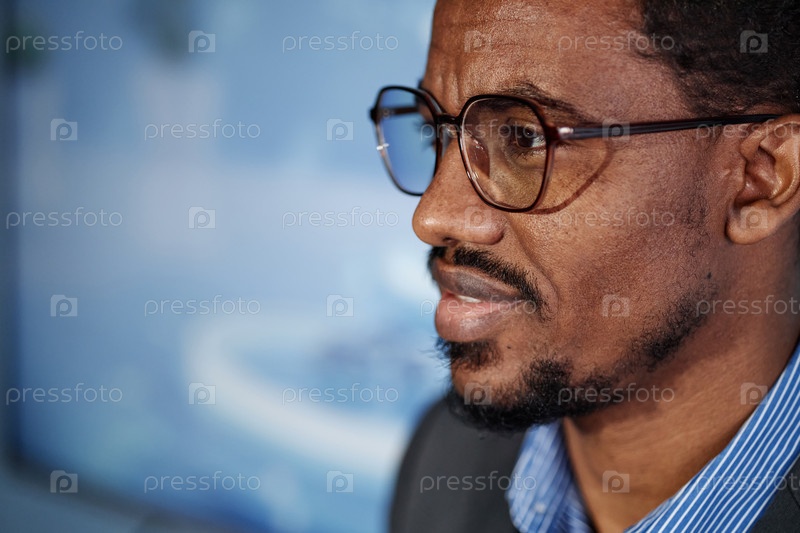 Улыбающийся чернокожий мужчина, носящий очки, представляет на бизнес-конференции