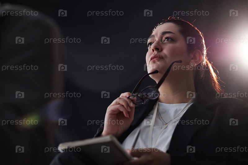 Женщина-участница деловой конференции с очками, слушающая речь в помещении