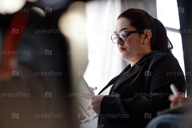 Женщина, пишущая в блокноте во время посещения деловой встречи в лекционной комнате