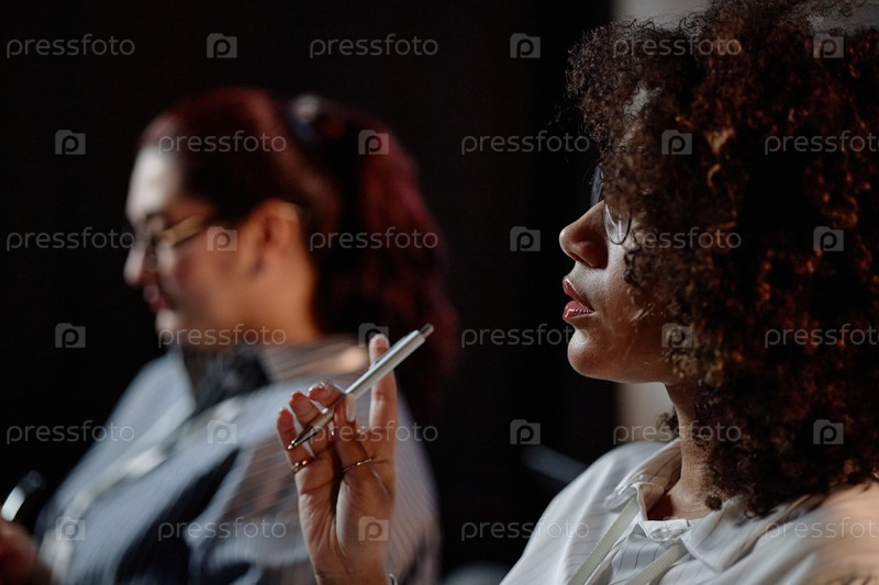 Профиль чернокожей женщины, поднявшей руку, чтобы задать вопрос на деловой встрече в помещении