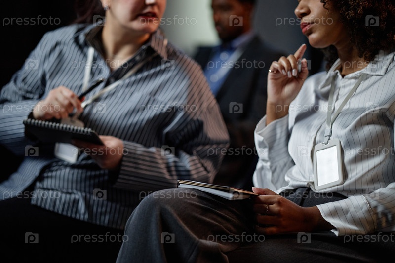 Две участницы женского бизнес-форума обсуждают презентацию в аудитории