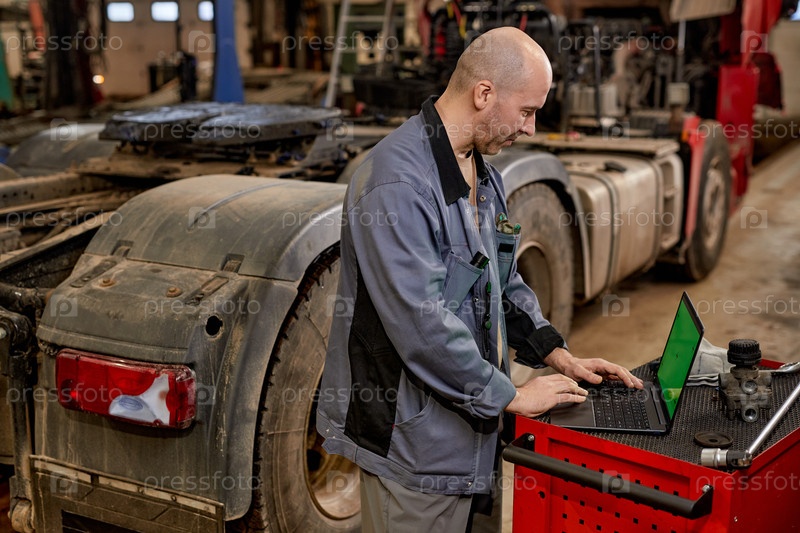 Механик работает на ноутбуке в автомобильной мастерской