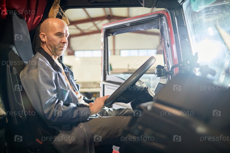 Человек, сидящий внутри грузовика с кабиной управления рулем