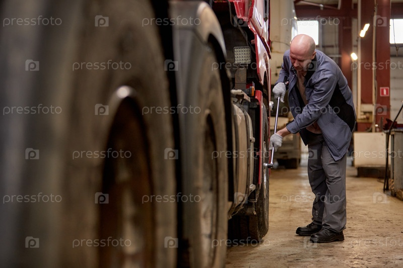 Работник по техническому обслуживанию ремонтирует грузовик в промышленном гараже