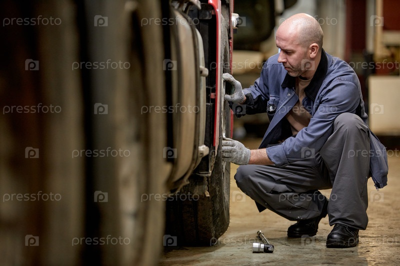 Механик, работающий на тяжелом транспортном средстве в мастерской