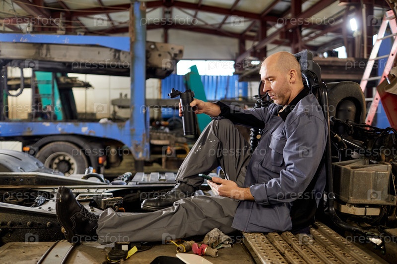 Механик, ремонтирующий транспортное средство сидит на полу магазина