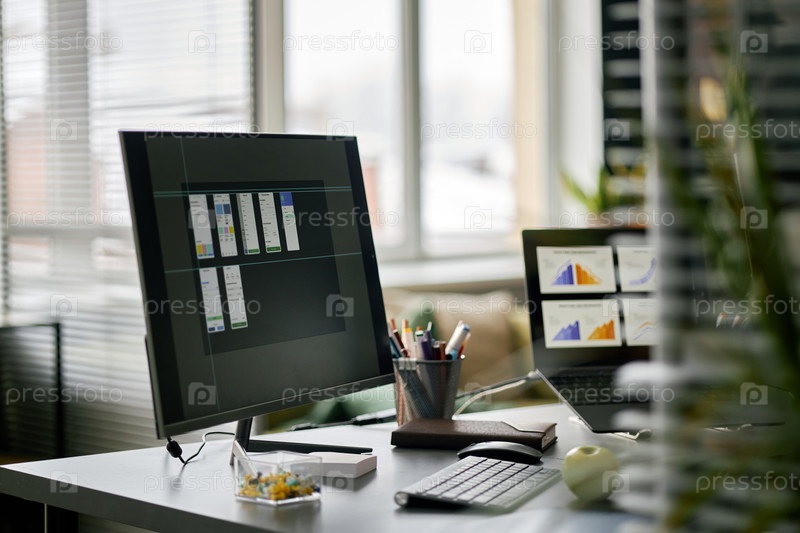 Офисное пространство, демонстрирующее современные рабочие станции и технологии
