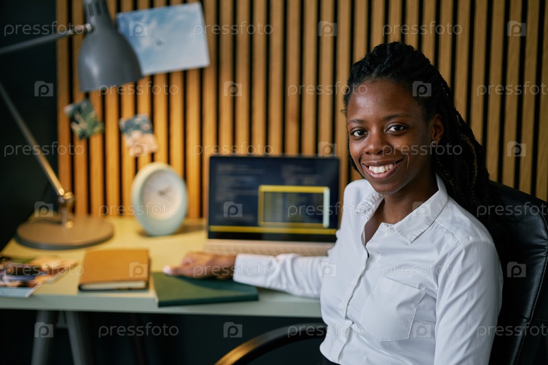 Портрет улыбающейся афроамериканской женщины, работающей
