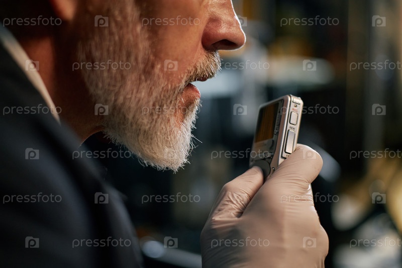 Старший человек, анализирующий ручное устройство в лабораторной обстановке
