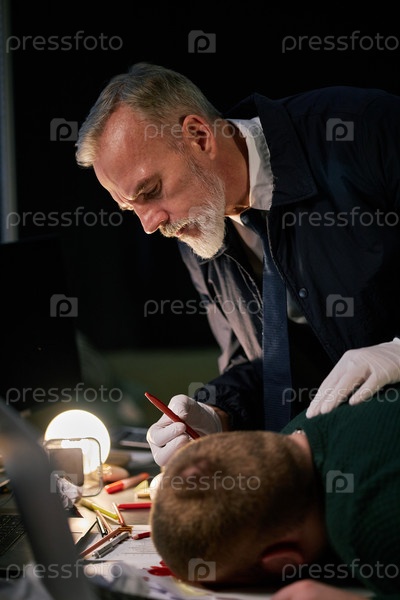 Пожилой мужчина работает, в то время как молодой человек отдыхает на столе