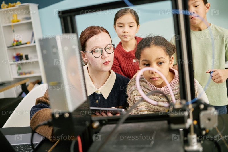 Молодые студенты и учителя вместе изучают робототехнику