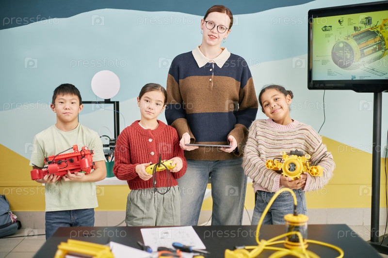 Группа студентов и учителя в классе робототехники