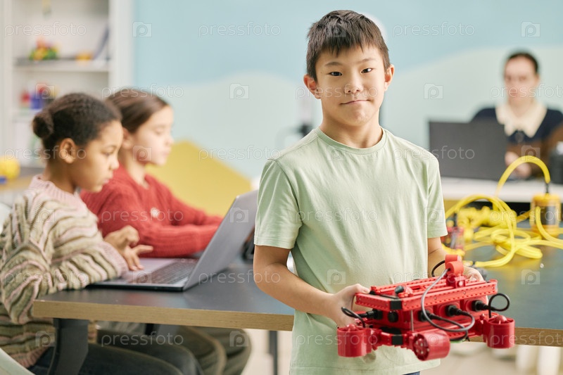 Портрет мальчика, держащего роботомодель в классе