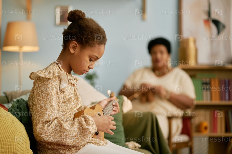 Черная девушка играет на укулеле в гостиной