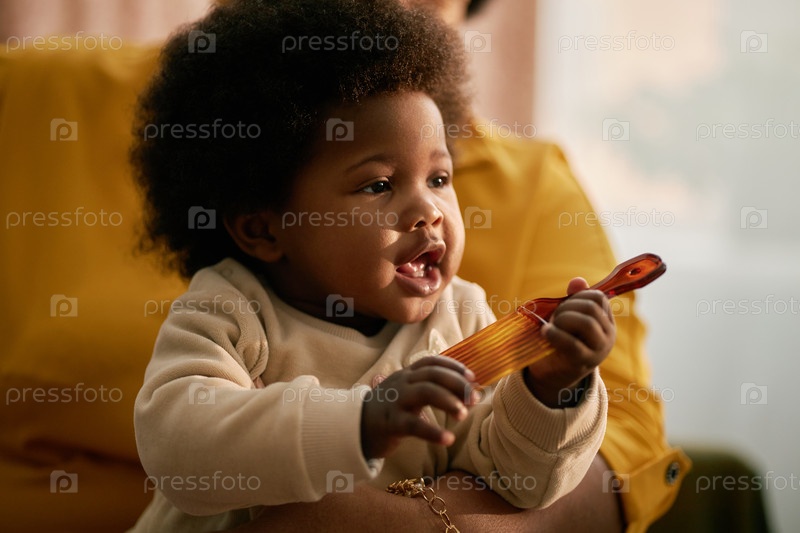 Игральная молодая черная девушка в руках взрослого, держащего щетку для волос дома