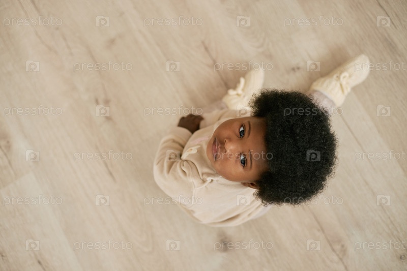 Очаровательный ребенок сидит на деревянном полу и смотрит домой