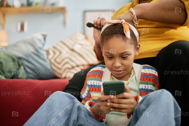 Черная девушка играет на телефоне, в то время как бабуля вяжет волосы детям дома